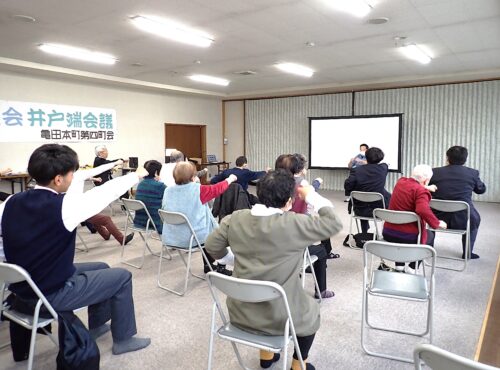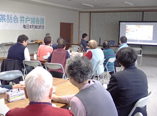11月9日(日)、本校ボランティア部員が亀田本町第4町会の方々と町会館で、楽しいひと時を過ごしました。前半はインストラクタ-の指導によるストレッチなどの体操を行いました。後半では昔の出来事、物品などの他、函館市の様子なども映し出された映像や、会員の方が実際に撮った写真を見ながら昔の話を聞くことができました。高校生が知らない時代を教えていただいたり、本校の話を伝えることができたりなど、楽しく和やかに歓談しました。これからもまた地域の方々と交流を深めていきたいと思います。