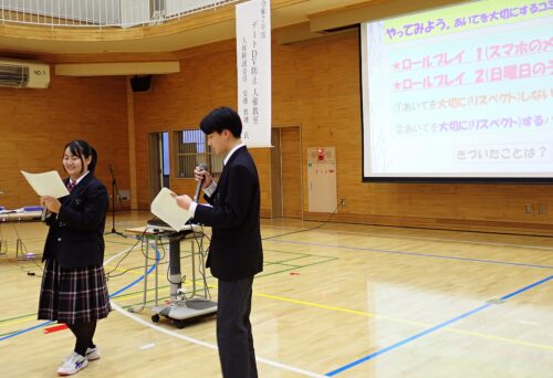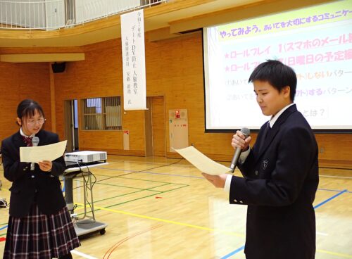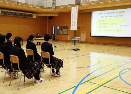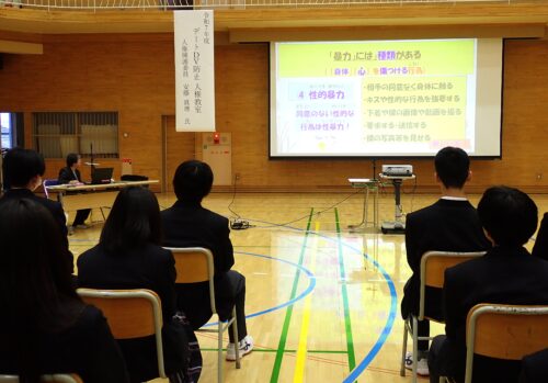 11月28日(金)、函館人権擁護委員の安藤眞理 氏を講師にお招きして、人権教室を開催しました。テ-マは「デ-トDV防止 」で、安藤氏より「人権」って何?、デ-トDVとは?、デ-トDVの種類、対等で平等な関係を築くためになど、わかりやすくお話ししていただきました。また、DVD視聴やロ-ルプレイを通じてより実践的にも学びました。生徒達はお互いの人権を尊重することの大切さを再認識することができ、とても貴重な講座でした。