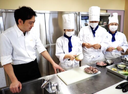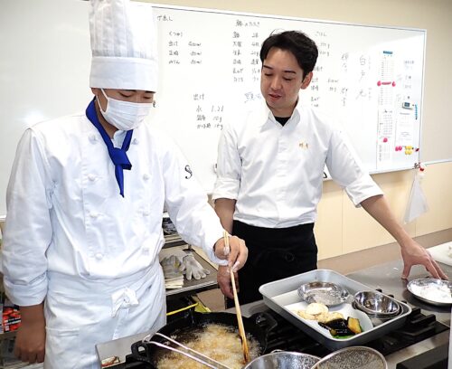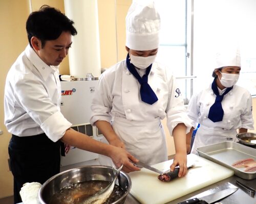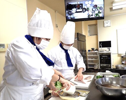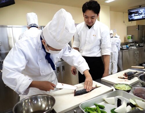 11月28日(金)、12月1日(金)調理科1年生が本校日本料理特別講師白戸先生の指導を受け「鰺のたたき」・「鰺と野菜の揚げ出し」に挑戦しました。生徒達はプロの卓越した技術に目を見張り、苦労しながら先生の熱心な指導のおかげで無事メニュ-を完成することができました。